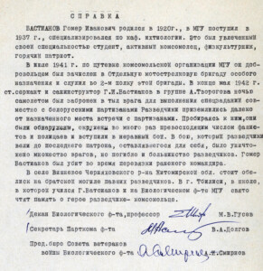 Прошел краткосрочные курсы санинструкторов и был зачислен ст. сержантом- санинструктором в особые войска НКВД. В конце мая 1942 г. в составе группы из 14 десантников был направлен за линию фронта для соединения с партизанами Мозырских лесов Белоруссии. Самолёт покинули ночью, а на рассвете выяснили, что им предстоит ещё путь около300 км. Сообщив об этом в Центр, группа направилась к пункту назначения. Шли по тылам врага ночью, осторожно. Во время отдыха в одной из крайних хат села Вишневое Черняховского р-на Житомирской области 3 июня 1942 г. отряд был окружен отрядом немцев и полицаев более 150 человек. Враги подожгли хату, десантники выскакивали через окна в плантацию хмеля и продолжали неравный бой всю ночь, уничтожив более полусотни врагов. В бою погибли 12 десантников. Гомер Иванович Бастианов погиб во время перевязки раненого командира отряда.