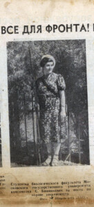 В первые месяцы войны состояла дежурной в команде по охране МГУ. С ноября 1941 года училась в Казанском Гос.Мед ин-те и работала в моб. отделе Райисполкома райкома комсомола.