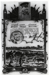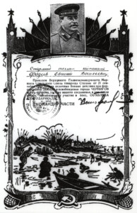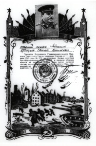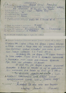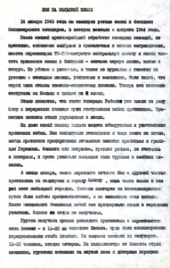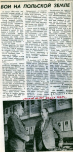 «Летом 1944 года 181-я дивизия находилась на участке Луцк-Ровно в составе войск 1-го Украинского фронта. Дивизия стояла в 40 км от Луцка на отдыхе в местечке Матушевка. Совсем недавно закончилось стремительное освобождение Украины, союзники открыли второй фронт. Настроение было бодрое, прибывало пополнение и боеприпасы. В то же время было замечено повышение активности нашей авиации. Самолеты буквально эшелонами шли на запад. И вот 23 июня 1944 года началось наступление под Порицком. После мощного артналета солдаты бросились в атаку. Сложность поставленной задачи состояла в том, что надо было преодолеть от 200 до 400 метров голой земли под огнем противника, потому что фашисты вырубили и выжгли все, что можно было , все то, что могло закрывать нас от них. Перед окопами была мертвая зона. Не пощадили ничего: ни домов, ни сады, ни хлеб — ничего. После почти часовой артподготовки солдаты ворвались во вражеские окопы, но немцев там не было. И только на второй линии окопов нашим пришлось вести серьезный бой. Но и там фрицы недолго держались. Так войска 181-й дивизии вступили в предбугский район. Положение осложнялось тем, что в этих местах оккупанты разжигали национальную вражду между украинцами и поляками. Уже в начале июля наши войска подошли к Бугу : немцы бежали, не оказывая никакого сопротивления. Закрепились они на западном берегу Буга. После артподготовки наши ребята форсировали реку. Немцы оказывали жесточайшее сопротивление. Несколько раз нашим войскам приходилось штурмовать берег. В конце концов сопротивление было сломлено , и дивизия закрепилась на левом берегу. В это время меня направили в разведгруппу. В 3-х км от Буга наша разведгруппа вышла к маленькой деревушке, у которой стоял щит, на котором было написано название деревни. Так мы узнали, что находимся на польской территории. Задерживаться было некогда. И группа форсированным маршем двинулась дальше к Замостью. Продвинувшись еще на 40 км вперед, мы подошли к реке, на лодках переплыли через нее и, когда выходили из лодок, нас уже встречали поляки. Девушки дарили цветы или просто осыпали нас ими. Люди испытывали великую радость от сознания того, что они наконец-то свободны, независимы. Но радости радостями, а приказ есть приказ. Мы двинулись дальше. Выйдя к городу Замостье, в его пригороде мы натолкнулись на немецкий аэродром, с которого, отстреливаясь, удирали фашисты. Вошли в город. Он был небольшой: одноэтажные дома, неширокие улочки. Фашисты жгли город. На улицах завязалась перестрелка, но немцы быстро отошли. Дальше до Вислы мы двигались на трофейных грузовиках и почти не встречали немцев, которые в спешном порядке отходили. Местами встречались партизаны. Партизаны были разные: армия Людова и армия Крайова. Первые относились к нашим солдатам приветливо и, вообще, по-дружески. Партизаны армии Крайовой относились более сдержанно: они были проанглийской ориентации. Население же встречало русских как истинных освободителей: радушно и приветливо. На Вислу вышли очень быстро. Перед дивизией была поставлена задача провести иммитацию форсирования Вислы. Нас перебросили на островки посреди реки. Под прикрытием дымовой завесы, которую мы ставили, началось форсирование. На другом берегу в три ряда были немецкие окопы. В течение 4–5 дней советские воины на плотах, на лодках и др. плавучих средс