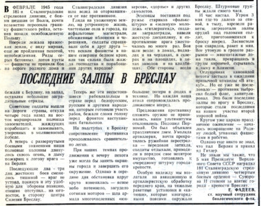 «В первых числах мая окружение группировки было закончено, кольцо замкнулось, и 4 мая группировка капитулировала. Советские войска как освободители вошли в древний польский город Вроцлав на реке Одра. Мы вошли в город с запада. Предместья и окраины были превращены в руины. Кругом дымились развалины, остатки домов. Но, к счастью, центральная часть города вместе с историческими памятниками, ратушей, университетом уцелела. Это было достигнуто благодаря самоотверженности советских воинов, дальновидности нашего командования и благоразумию немецкого, которое, поняв, что песенка фашистов спета, во время капитулировало. Так мы закончили военные действия в Польше. После подписания капитуляции фашистской Германией 7 мая 1945 года в Потсдаме, нас перевели из Польши в Австрию».