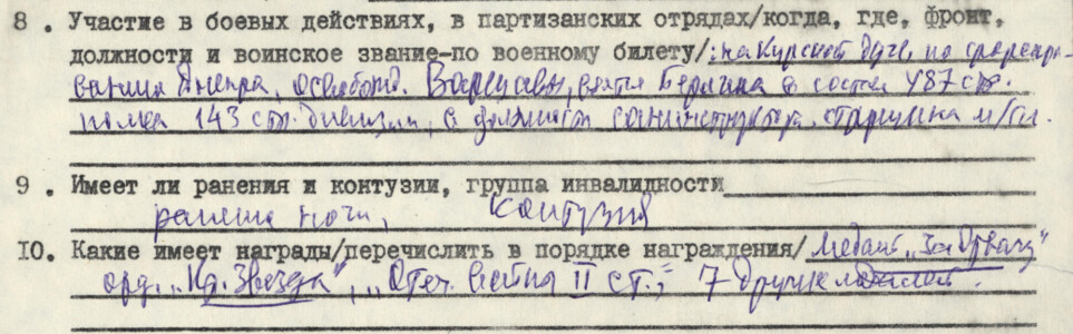 На войне с 23 июня 1941 года по ноябрь 1945 года, санинструктор, старшина медицинской службы в санроте. Участвовал в битве на Курской дуге, где был контужен, в форсировании Вислы, Одера, во взятии Берлина. Был награжден двумя орденами Отечественной войны II степени, орденом Красной звезды, медалями «За отвагу», «За освобождение Варшавы», «За взятие Берлина», «За победу над Германией».