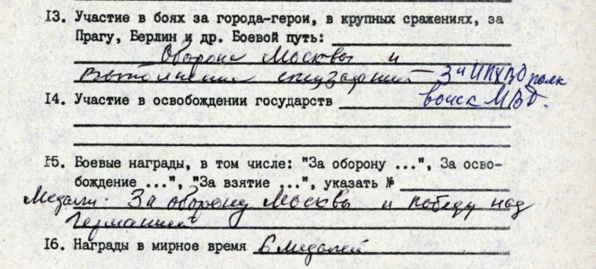 Принимал участие в финской войне. В самом начале ВОВ был демобилизован и принимал участие в обороне Москвы и выполнении заданий в войсках МВД; служил в инженерно-противохимическом полку с июня 1941 г. по май 1945 г. Был награжден орденом Отечественной войны II степ., медалями «За оборону Москвы», «За победу над Германией» и др.
