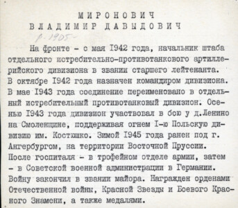 Участник обороны Москвы, на фронте — с мая 1942 года, начальник штаба отдельного истребительно-противотанкового артиллерийского дивизиона в звании старшего лейтенанта. Воевал на Западном, 3-ем Белорусском и 1-ом Украинском фронтах. В октябре 1942 года В.Д. Миронович назначен командиром дивизиона. В 1945 году на территории Восточной Пруссии был ранен. Войну закончил в звании майора. Награжден орденами Отечественной войны 1-й степени, Красной Звезды и Боевого Красного Знамени, а также медалями «За взятие Кенигсберга», «За доблестный труд во время Великой Отечественной войны» и другими.