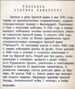 «Воевать начал на Дальнем Востоке. Прошел Хасан, Халкингол. На западном фронте в Великой Отечественной войне были: Старый Оскол, Новый Оскол, Белорусский фронт, Кенигсберг, затем Шепетовка, Бзямпл, Паста, Тернополь, Висл, Зварже и потом польская граница. Направление держали — на Берлин. Шли через Польшу. Когда перешли границу, все очень радовались: наша страна свободна! Мы рвались покончить с фашистами. Наши политработники говорили, что мы идем по территории, где народ ненавидел фашизм, но было немало людей, которые ненавидели и русских, поэтому надо быть предельно внимательным в отношениях с населением, не допускать самосудов, особенно с немецким населением. Ведь мы ОСВОБОДИТЕЛИ!