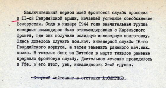 С ноября 1941 г. по июль 1943 г — рядовой Северо-Западного фронта, 1257 отдельный сапёрный батальон 34 армии, 200 минно-инженерный батальон Первой ударной армии. С августа 1943 по январь1944 – участвует в боях на карельском фронте. Январь — март 1944 г. – нач. инж. полка 40 дивизии 1678 корпуса. В марте 1944 г. получил тяжелое ранение. Войну закончил ст. лейтенантом инженерных войск. Инвалид Отечественной войны третьей группы.
